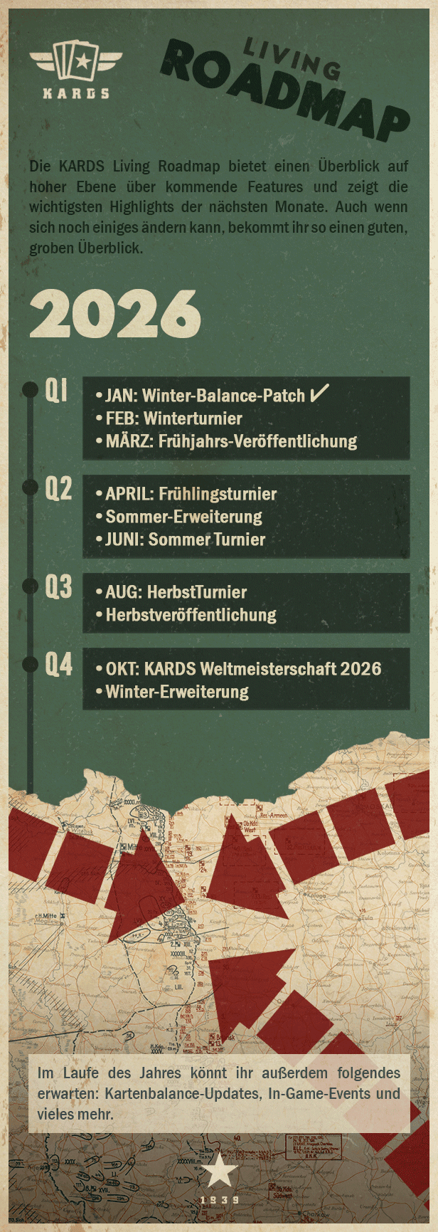 Mit dem Eintritt in das Jahr 2026 ist es an der Zeit für ein aktualisiertes Briefing über die kommenden Entwicklungen in KARDS. Mit diesem Update unserer Living Roadmap geben wir euch einen Überblick über die wichtigsten Dinge, die wir für dieses Jahr geplant haben.