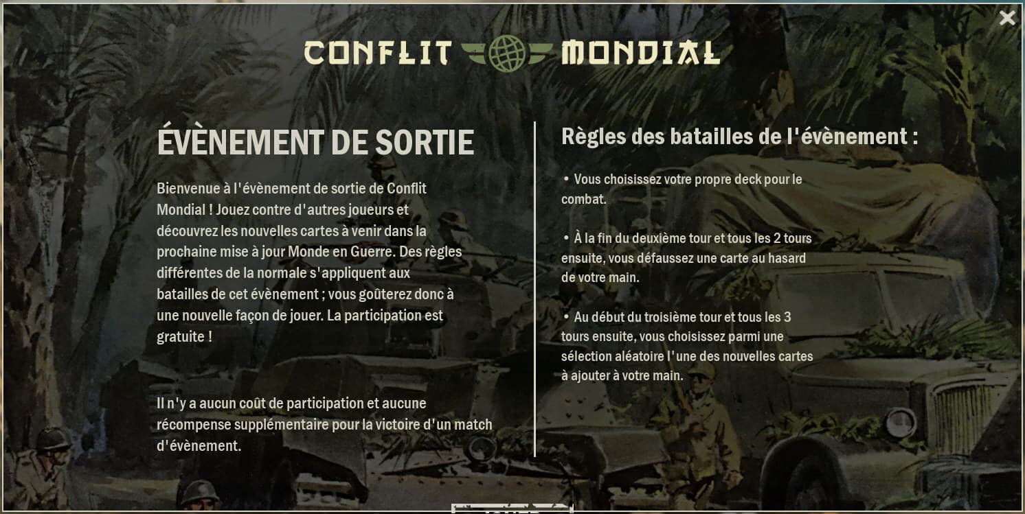 Il vous permet de profiter gratuitement de toutes les nouvelles cartes « Conflit Mondial », même si elles ne font pas partie de votre collection. Un ensemble de règles spéciales pimente cet évènement.