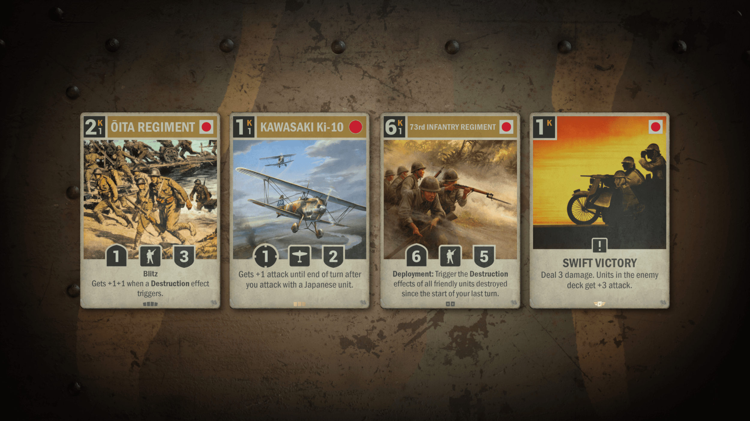 La chiave della strategia ad alto rischio e alta ricompensa del Giappone all'inizio della guerra: infliggi 3 danni al tuo bersaglio ora, ma le unità nel mazzo nemico ricevono +3 attacco. Fanne buon uso e cogli l'attimo, questa è una carta a doppio taglio: giocala bene e può vincere la partita, ma sbaglia il tempismo e il tuo nemico tornerà con spirito vendicativo.