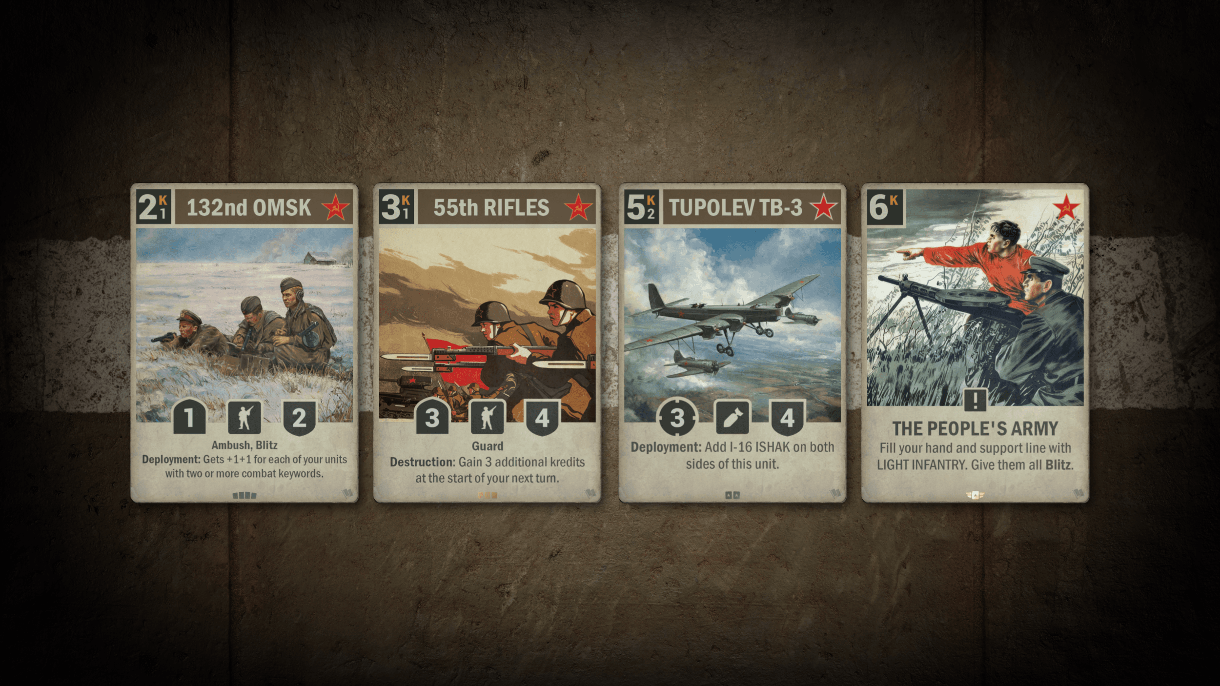Un'ordine di scala sovietica: questo ordine d'Élite riempie la tua mano e la linea di supporto con la famosa FANTERIA LEGGERA, dandogli Blitz. Un'ondata di truppe, velocità e un vantaggio immediato in termini di quantità, se non di qualità, questo è il cuore pulsante dell'Armata Rossa - non un passo indietro, Compagni!