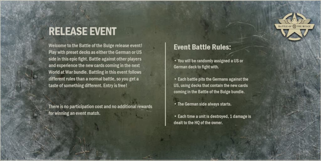 With this event, you can enjoy all the new Battle of the Bulge cards for free as you enter the battle on the side of Germany or the USA.
