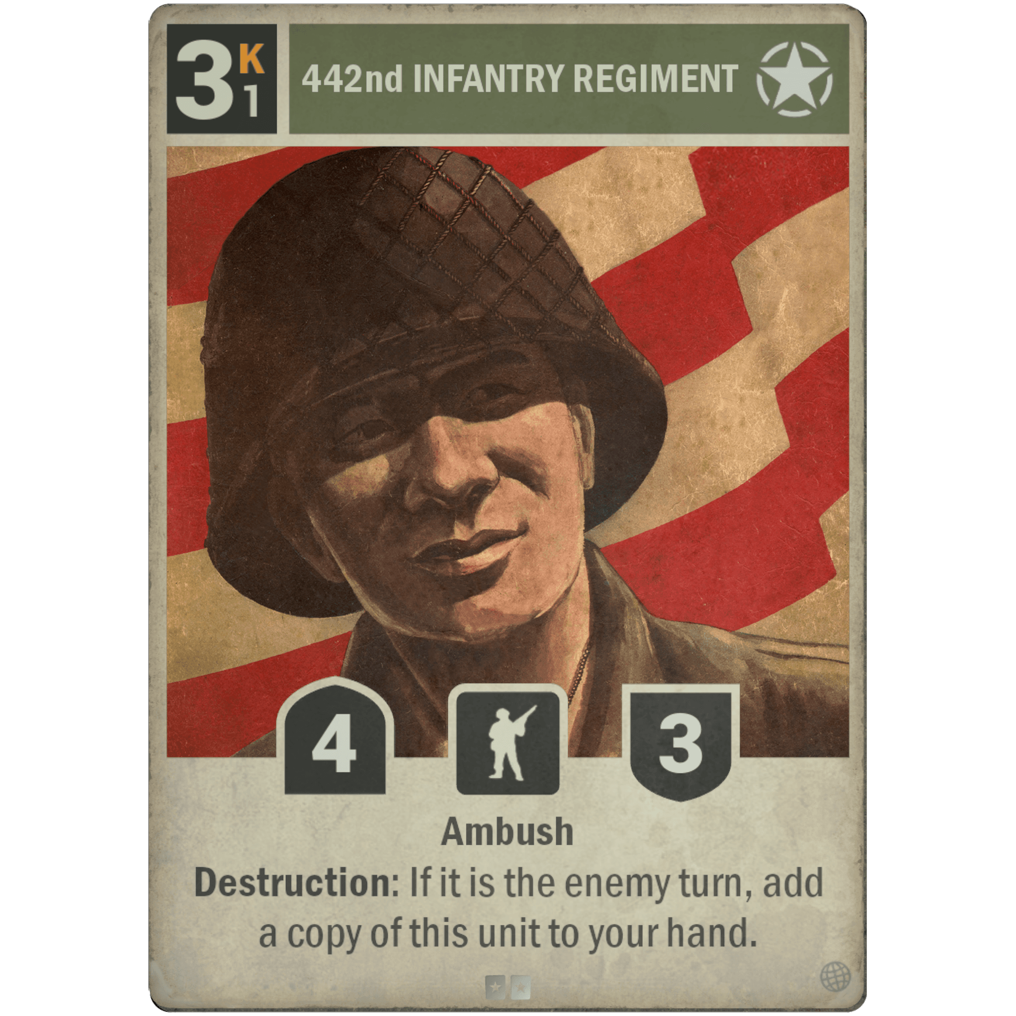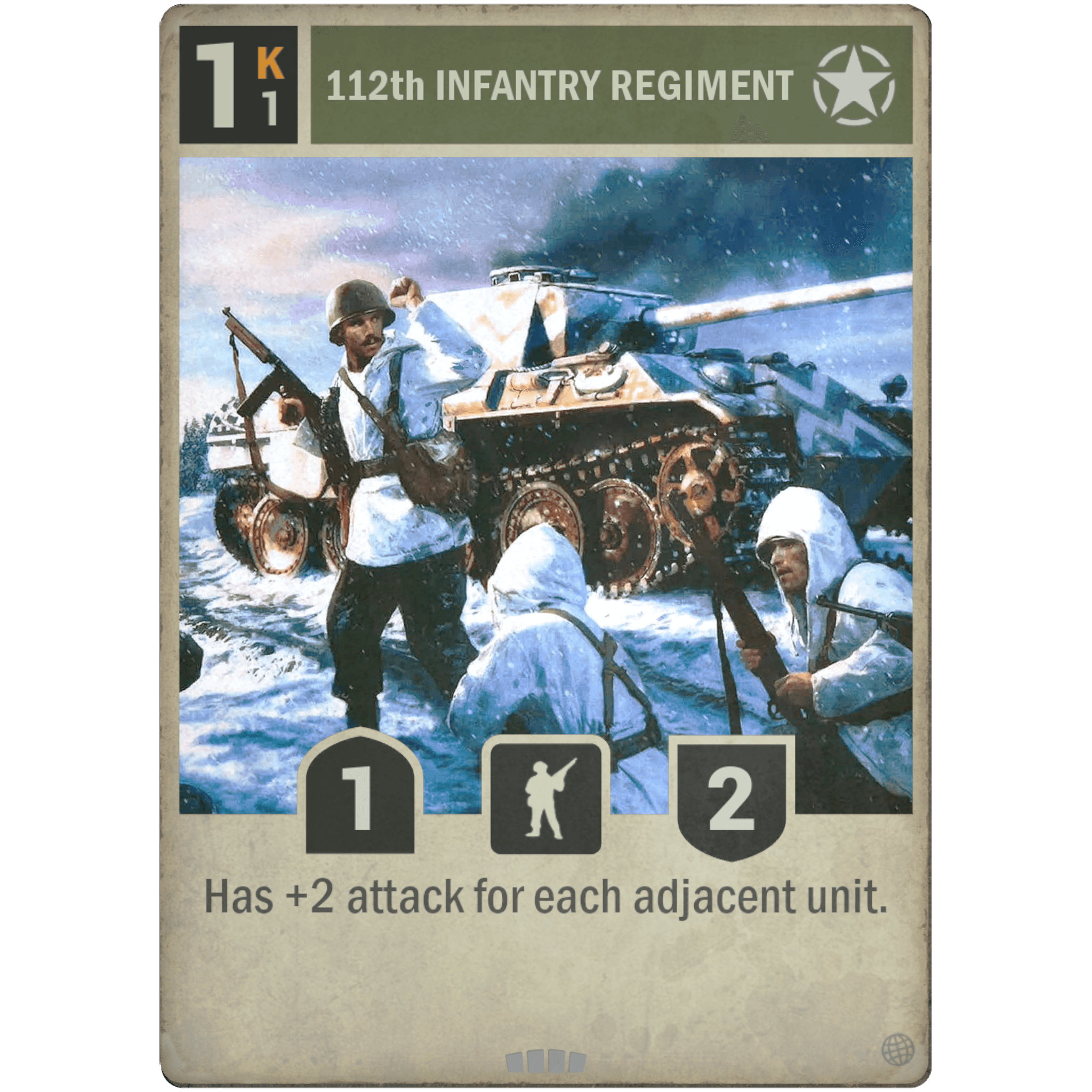 Without a doubt, the biggest and most iconic card of this update is the legendary German King Tiger panzer. A behemoth in its own right, this elite card will be a pride to any collector. Not every unit needs to be such a monster. As history shows, even seemingly weaker units can turn the tide of the battle. For example, the US 112th Infantry Regiment saw heavy action during the Battle of the Bulge and was in the center of the attack.