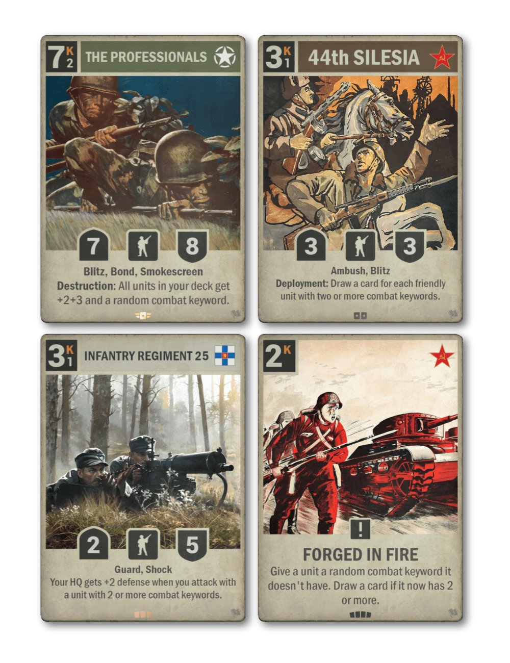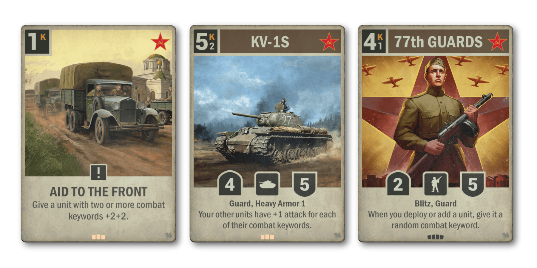 Cards like AID TO THE FRONT, KV-1S, and 77th GUARDS showcase how these mechanics interact - boosting units with multiple combat traits or granting new ones in the heat of battle.