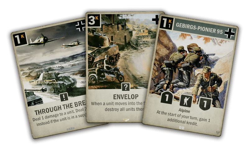 As the new Elite card, the Germans get Envelop, a countermeasure of cost 3. This countermeasure destroys all units in the frontline when the enemy moves a unit into it. Very powerful!