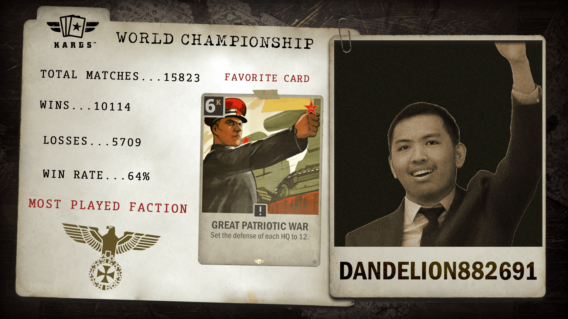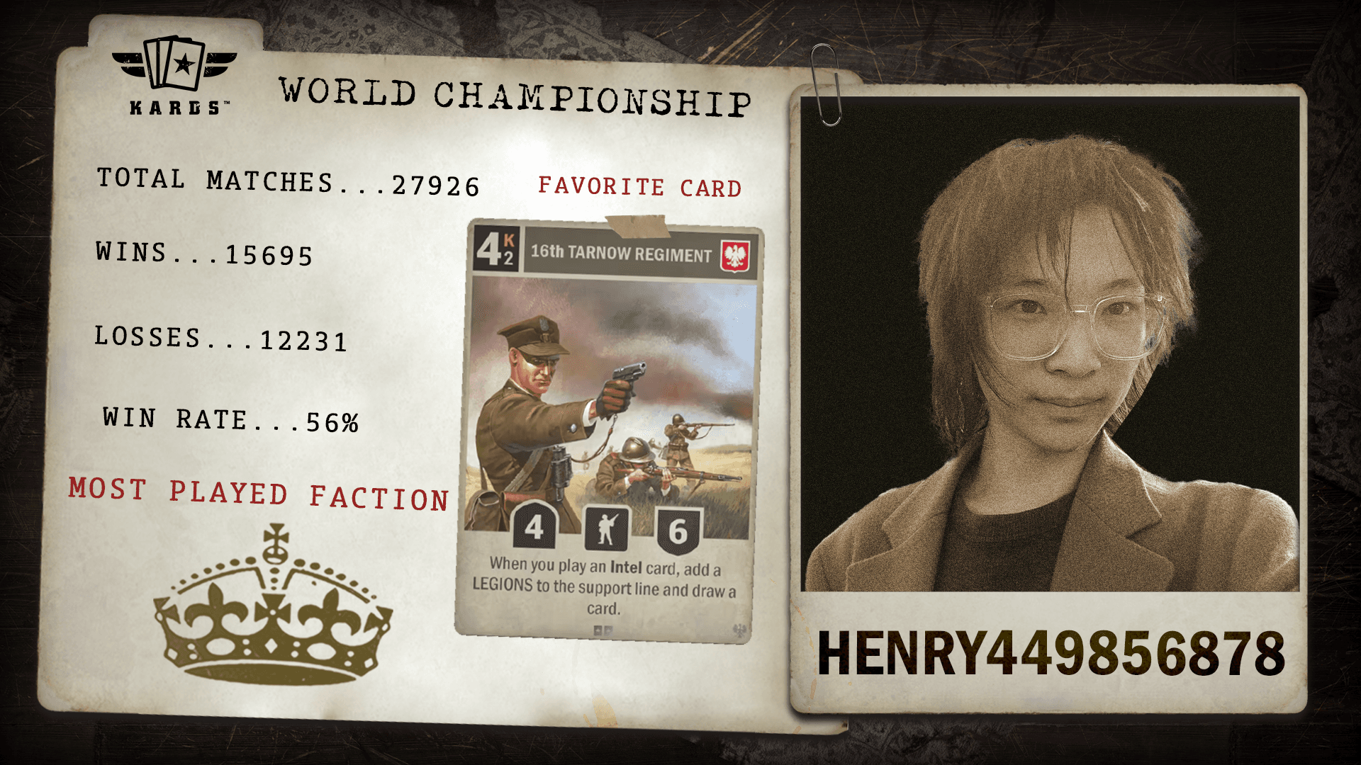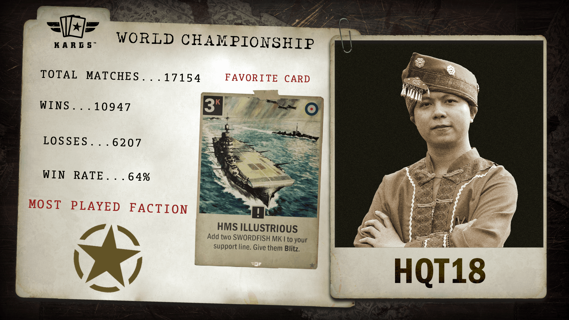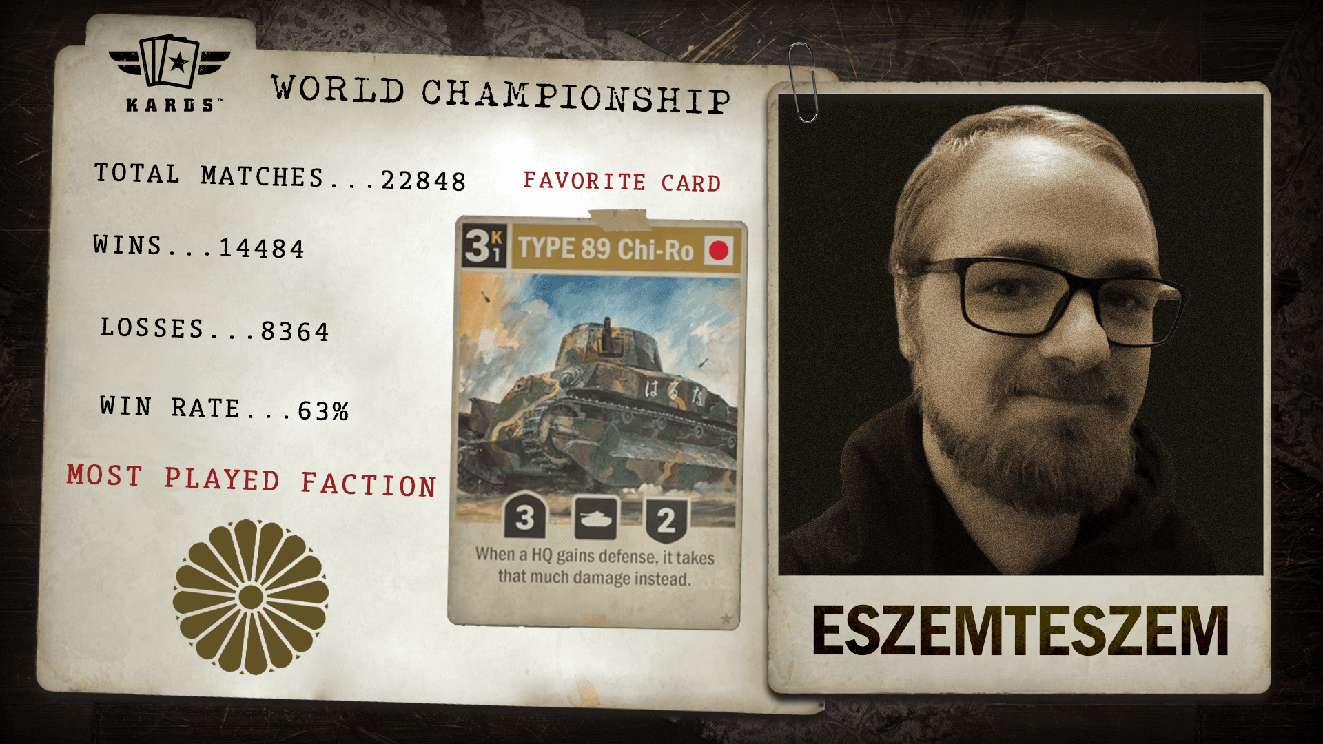 Having played over 22,000 matches since 2019, eszemteszem is among the most experienced Commanders in KARDS. With a 63.4% win rate and consistent performance over years of play, they bring veteran stability and a long competitive history to the World Championship.