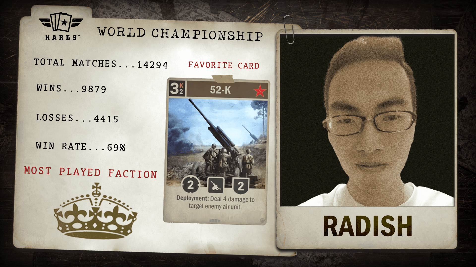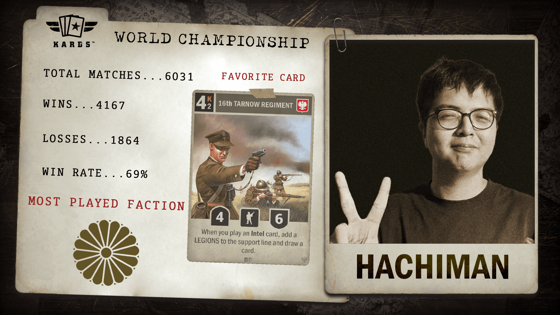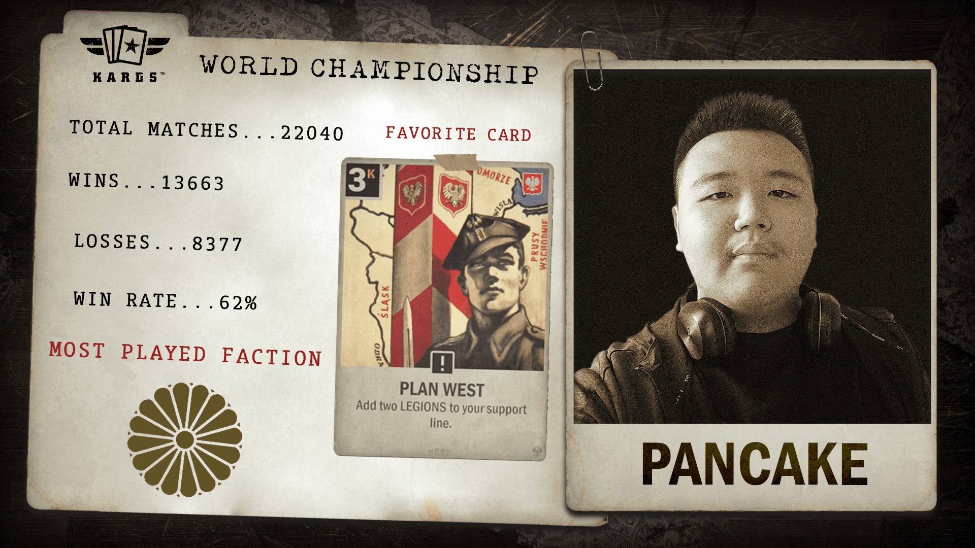 Having played over 22,000 matches since 2019, eszemteszem is among the most experienced Commanders in KARDS. With a 63.4% win rate and consistent performance over years of play, they bring veteran stability and a long competitive history to the World Championship.