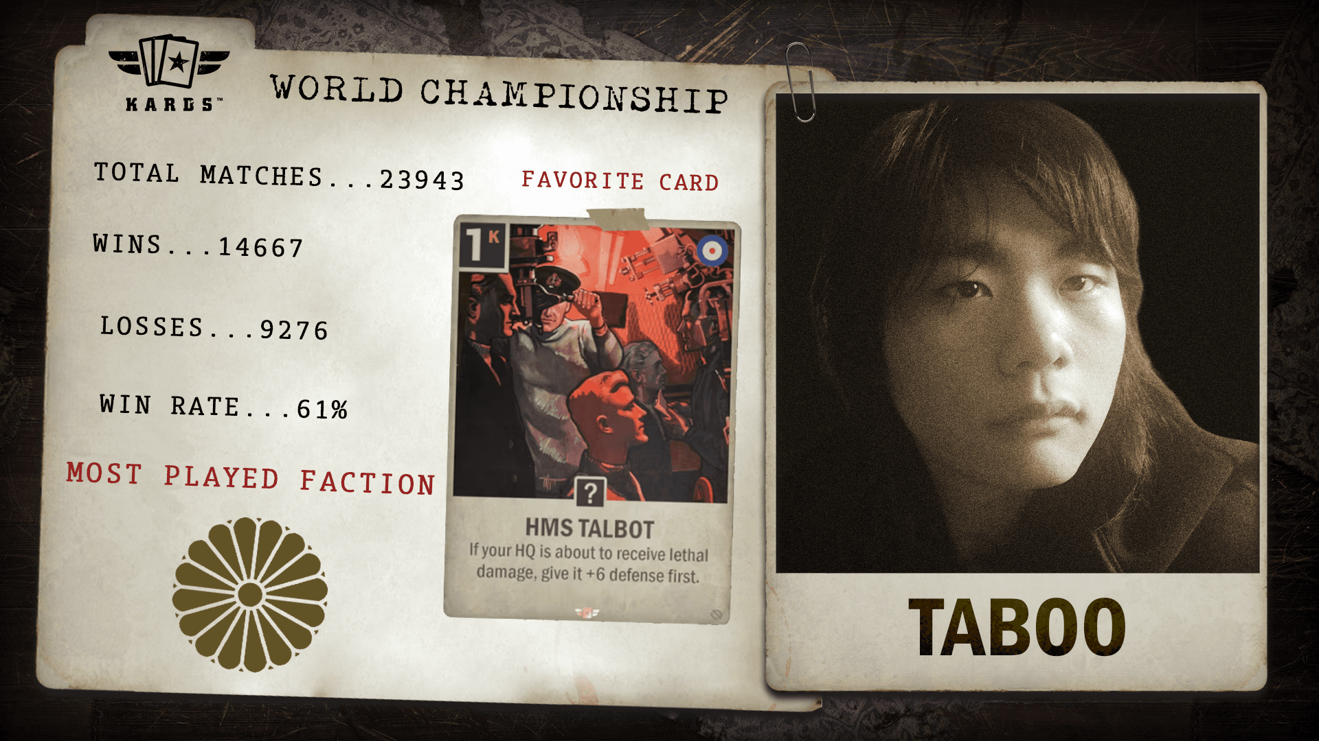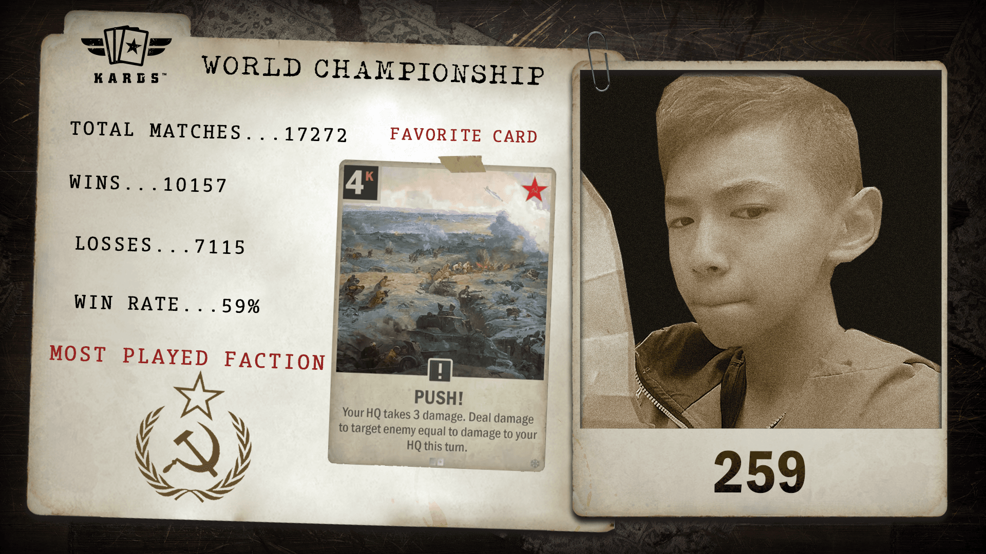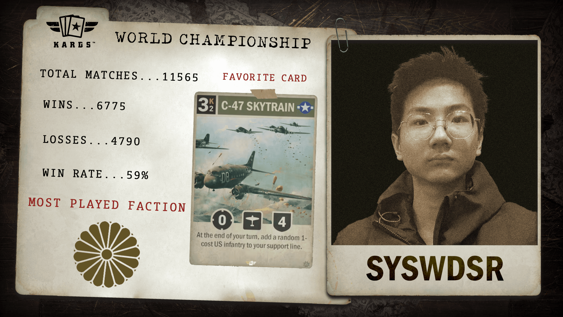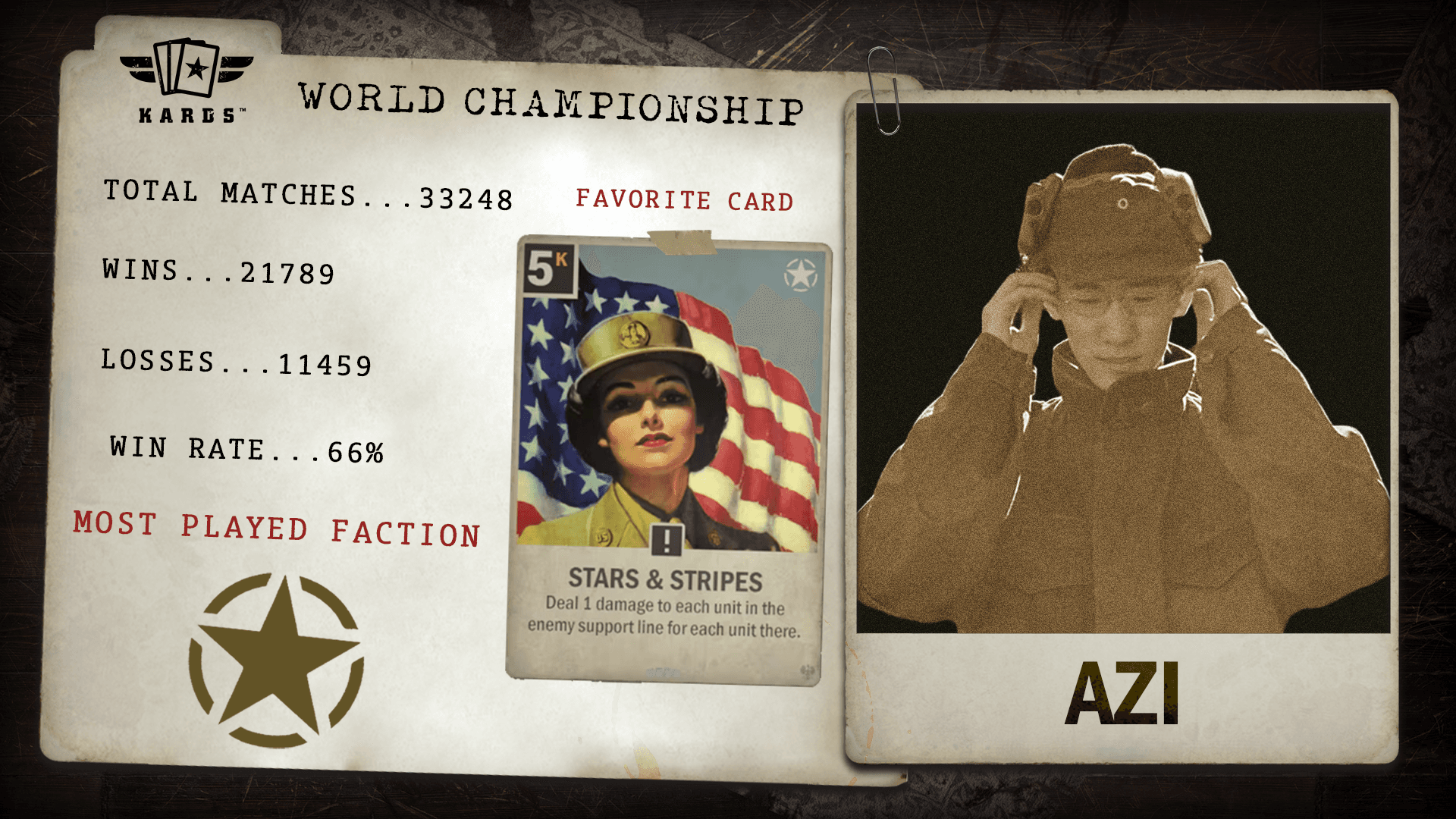 Having played over 22,000 matches since 2019, eszemteszem is among the most experienced Commanders in KARDS. With a 63.4% win rate and consistent performance over years of play, they bring veteran stability and a long competitive history to the World Championship.