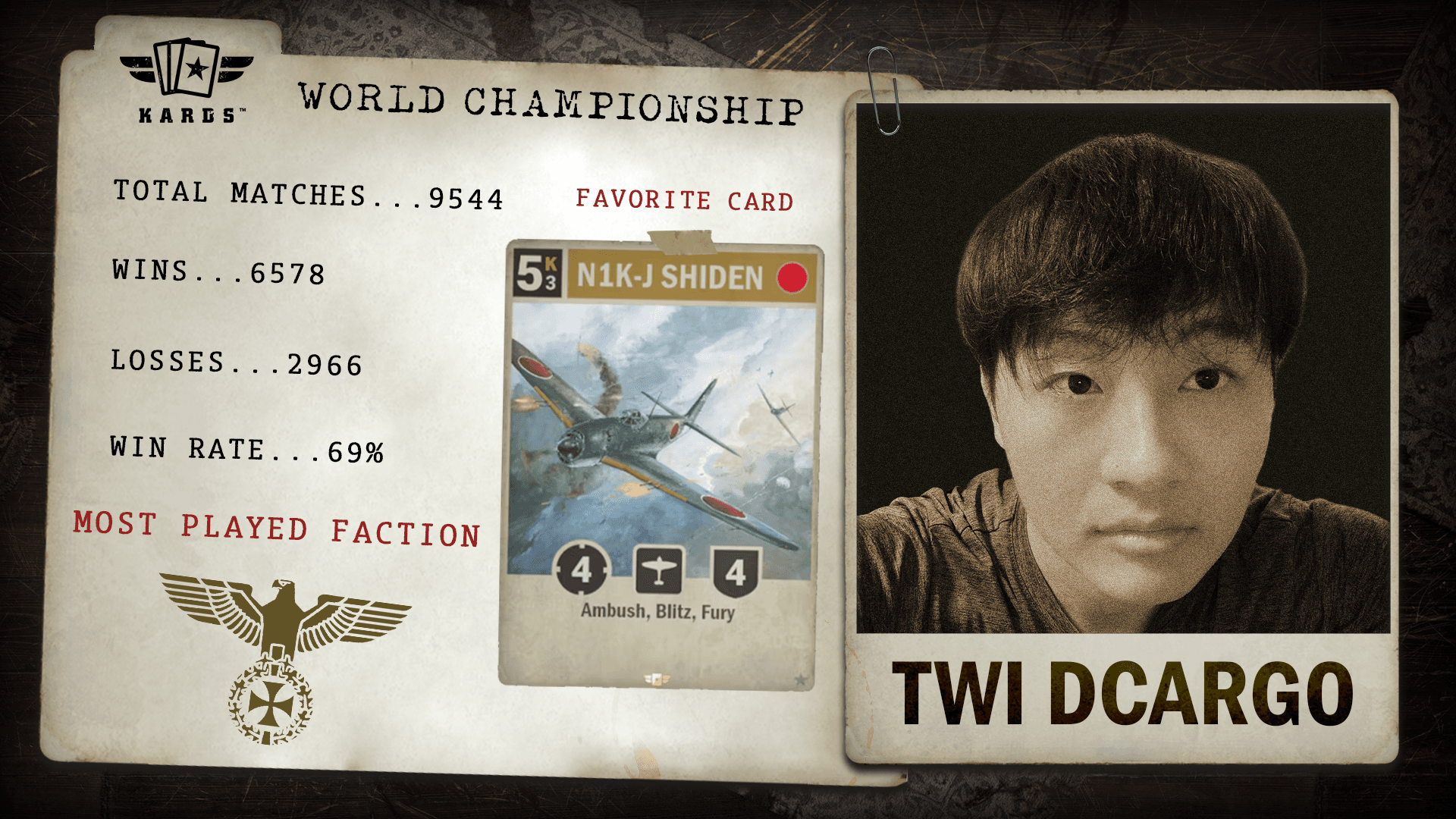 Joining KARDS in mid 2024, Twi Dcargo has made an impact on the competitive scene. With a 68.9% win rate across nearly 10,000 matches, their consistent results and swift climb through the ranks have secured them a well-earned spot in the World Championship.