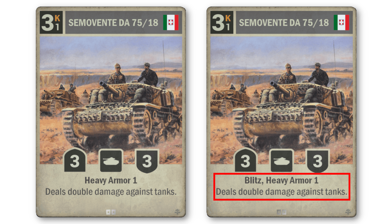 New: Blitz, Heavy Armor 1. Deals double damage against tanks.