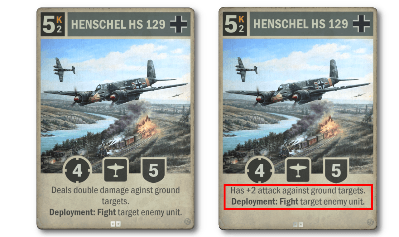 New: Has +2 attack against ground targets. Deployment: Fight target enemy unit.