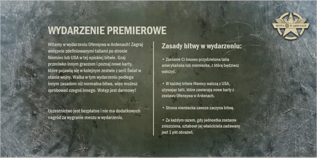 Dzięki temu wydarzeniu możesz za darmo korzystać ze wszystkich nowych kart Ofensywy w Ardenach, przystępując do bitwy po stronie Niemiec lub USA.