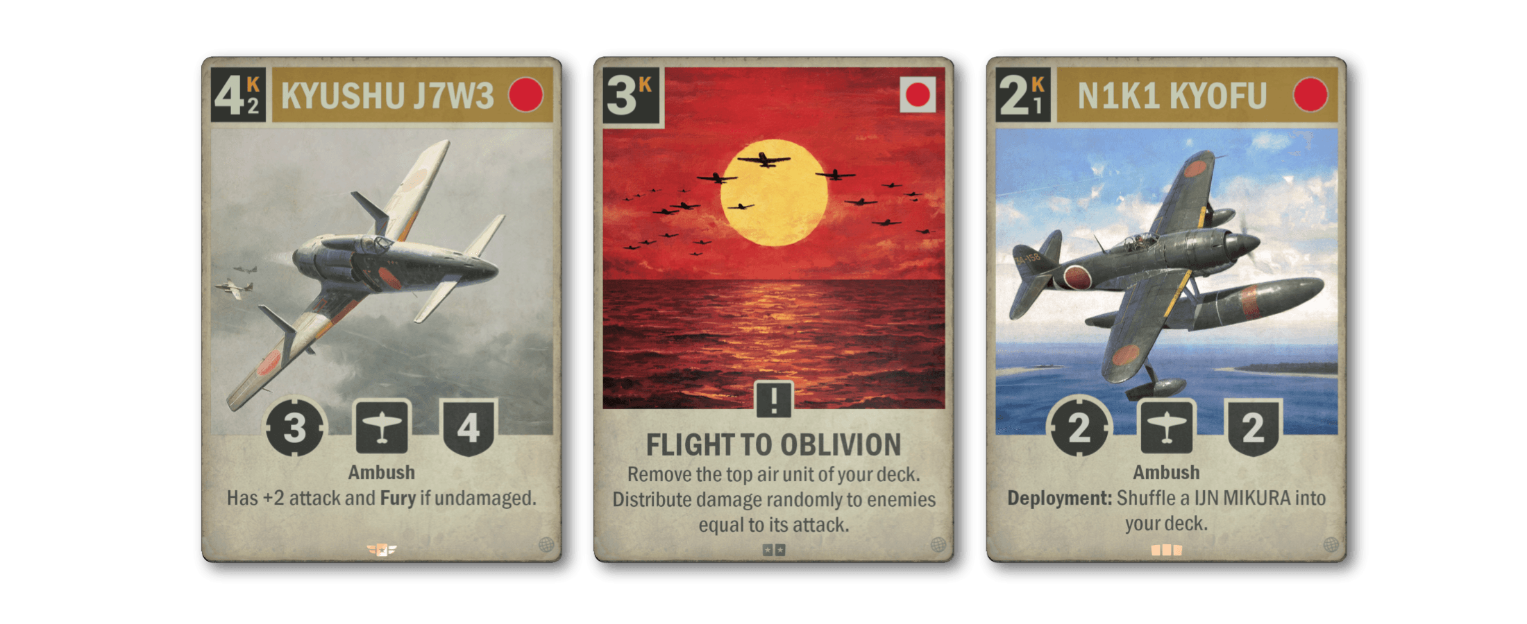 ПОЛЁТ В ОДИН КОНЕЦ (особая) - Жертвует верхний самолёт вашей колоды, неся разрушение вражеским отрядам и штабу. Оправданный риск, который может развернуть ход боя в вашу пользу.