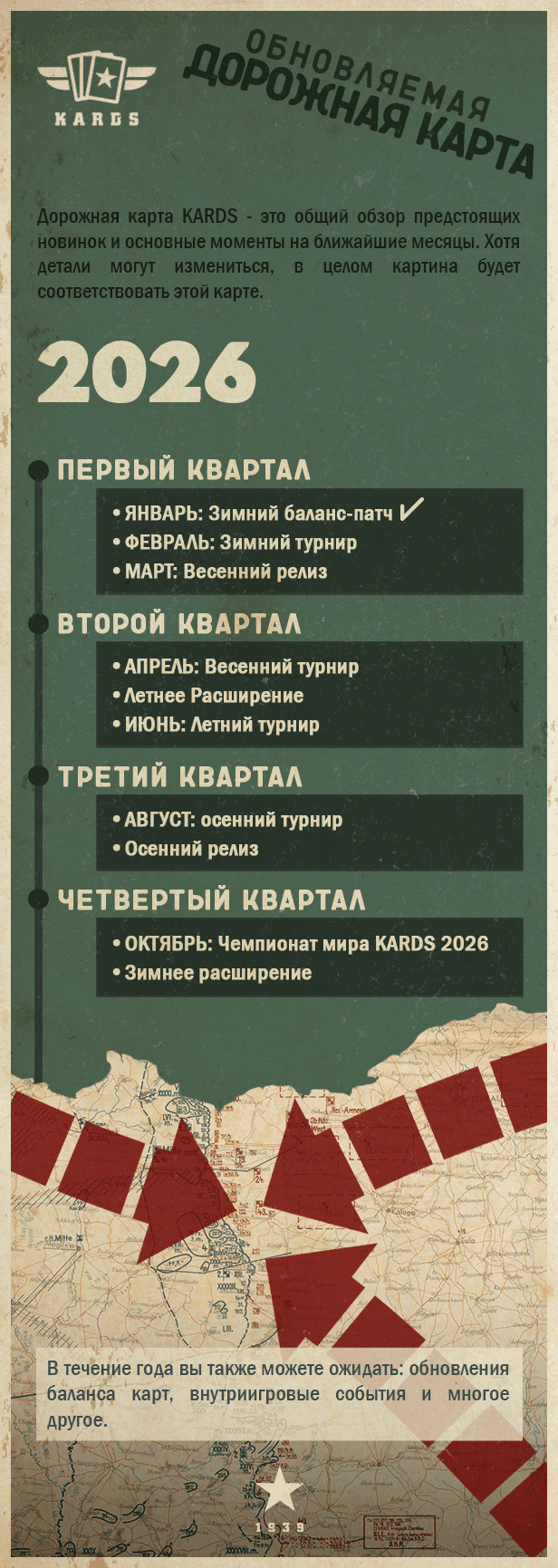 Дорожная карта KARDS представляет собой регулярно обновляемый общий обзор основных этапов игры KARDS - Карточной игры о Второй Мировой. Она фокусируется на главных событиях года:дополнениях, сезонных релизах и главных событиях, таких как турниры и чемпионат мира.