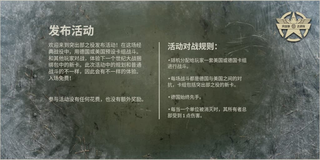 在这个活动中,玩家可以选择德国或美国参加战斗,免费试用所有新的突出部之役新卡。